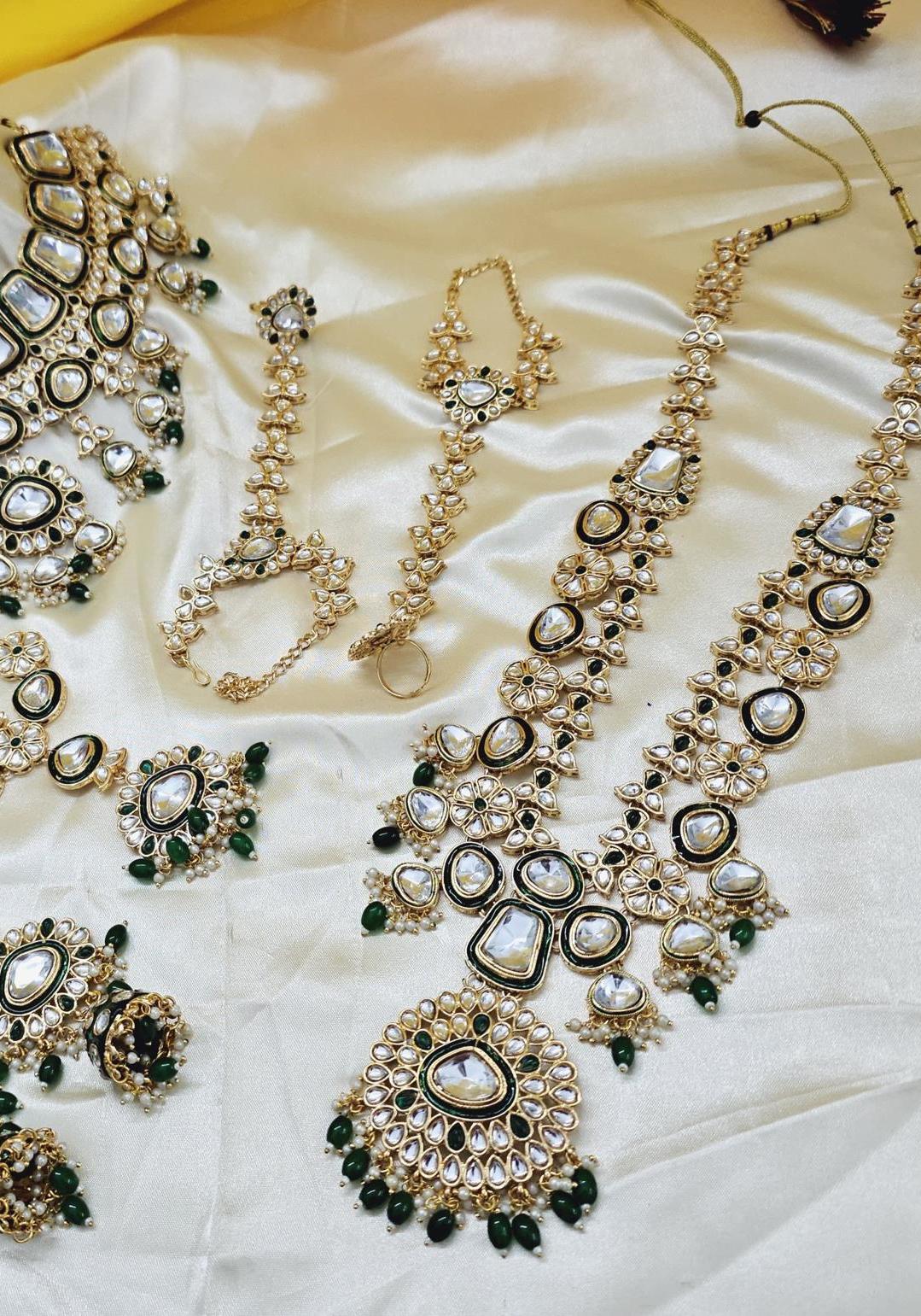 Details: 1 Long Set, 1 Heavy Chocker Set, Pair of Earrings, 1 Pair of Hathpan, 1 Mathapatti Set, 1 Nath [Nosering].