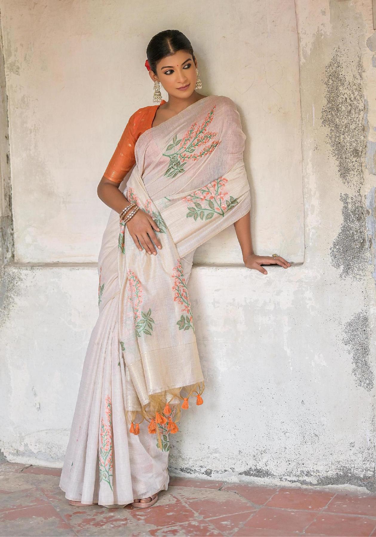 Work: Floral Weaving Pattern With Small Zari Patta On Pallu With Classic Tassels.