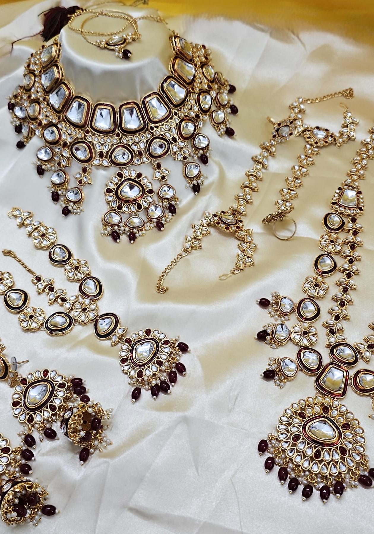 Details: 1 Long Set, 1 Heavy Chocker Set, Pair of Earrings, 1 Pair of Hathpan, 1 Mathapatti Set, 1 Nath [Nosering].