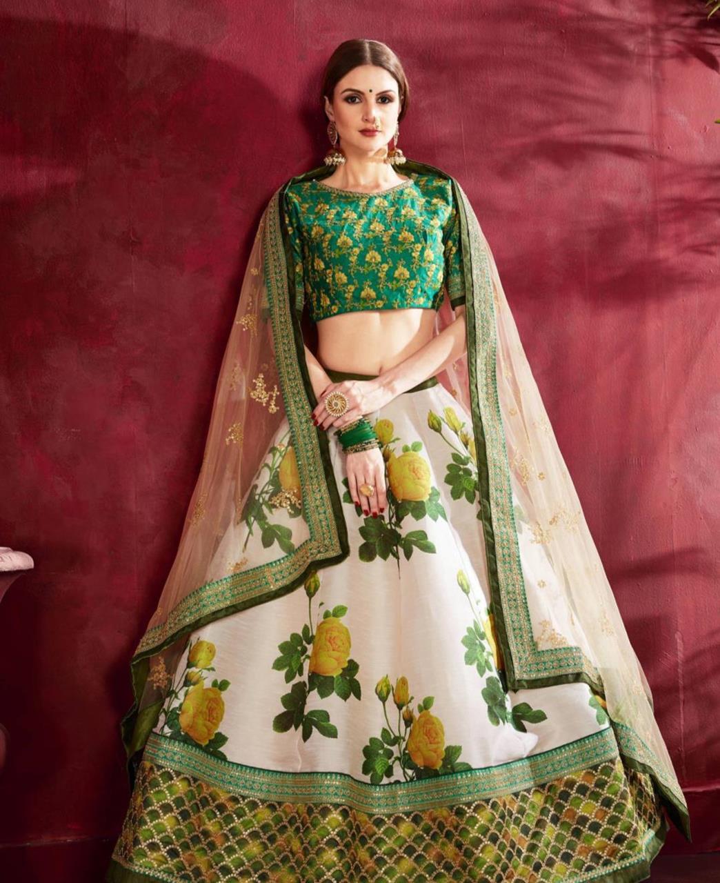 Lehenga Choli is Designed with Floral Print, Dori, Zari AND Sequins Embroidery.