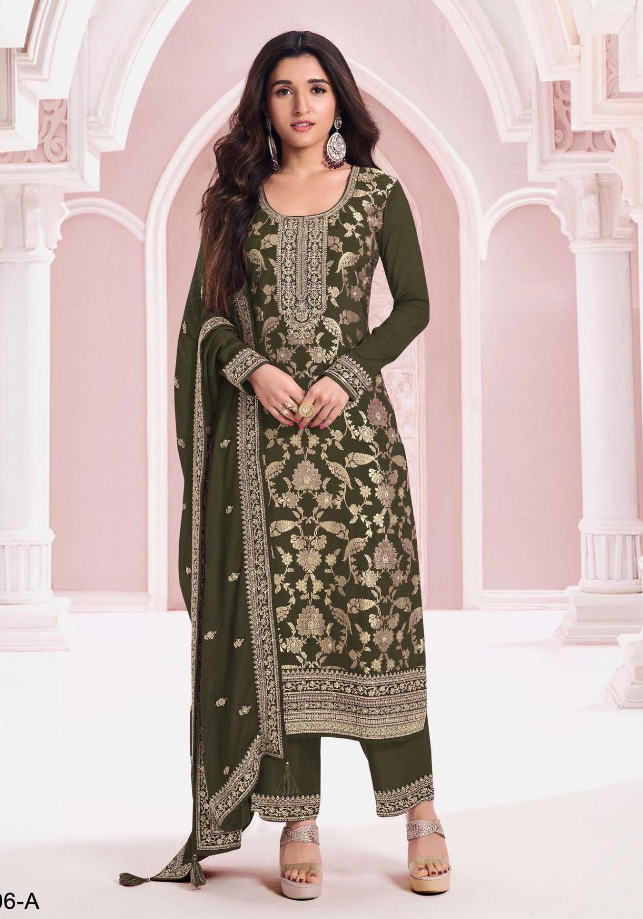Buy Chiffon Dark Olive Green Straight Cut Salwar Kameez online.