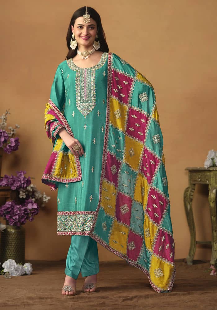 Buy Chiffon & Silk Dark Cyan Straight Cut Salwar Kameez online.