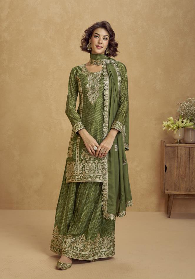 Buy Chiffon & Silk Dark Olive Green Straight Cut Salwar Kameez online.