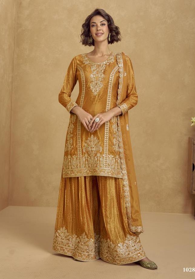 Chiffon & Silk Golden Rod Straight Cut Salwar Kameez