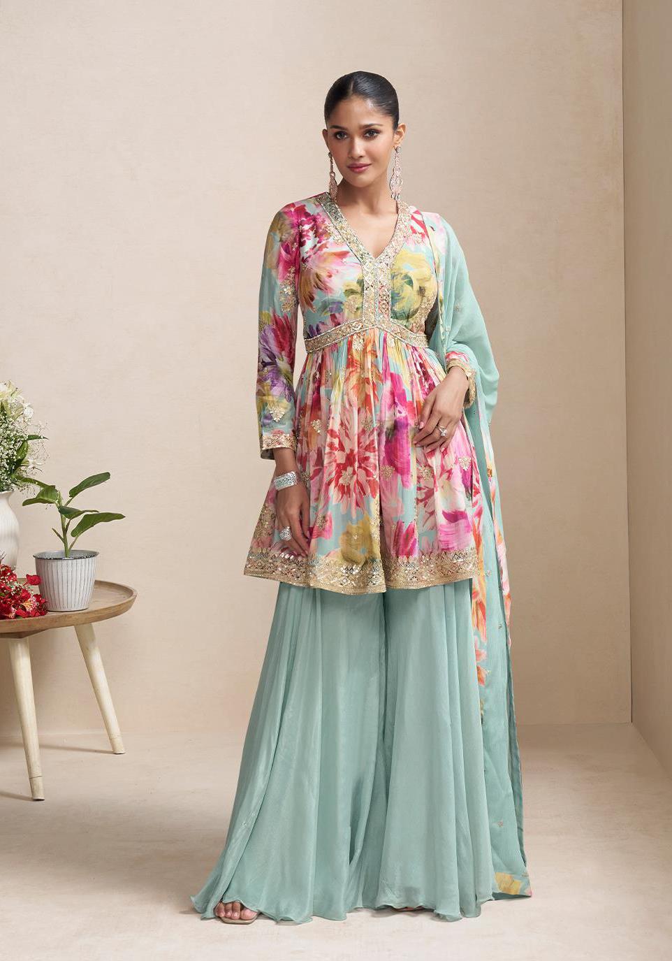 Normally size is measured between the underarm stitching lines from the stressed kameez.