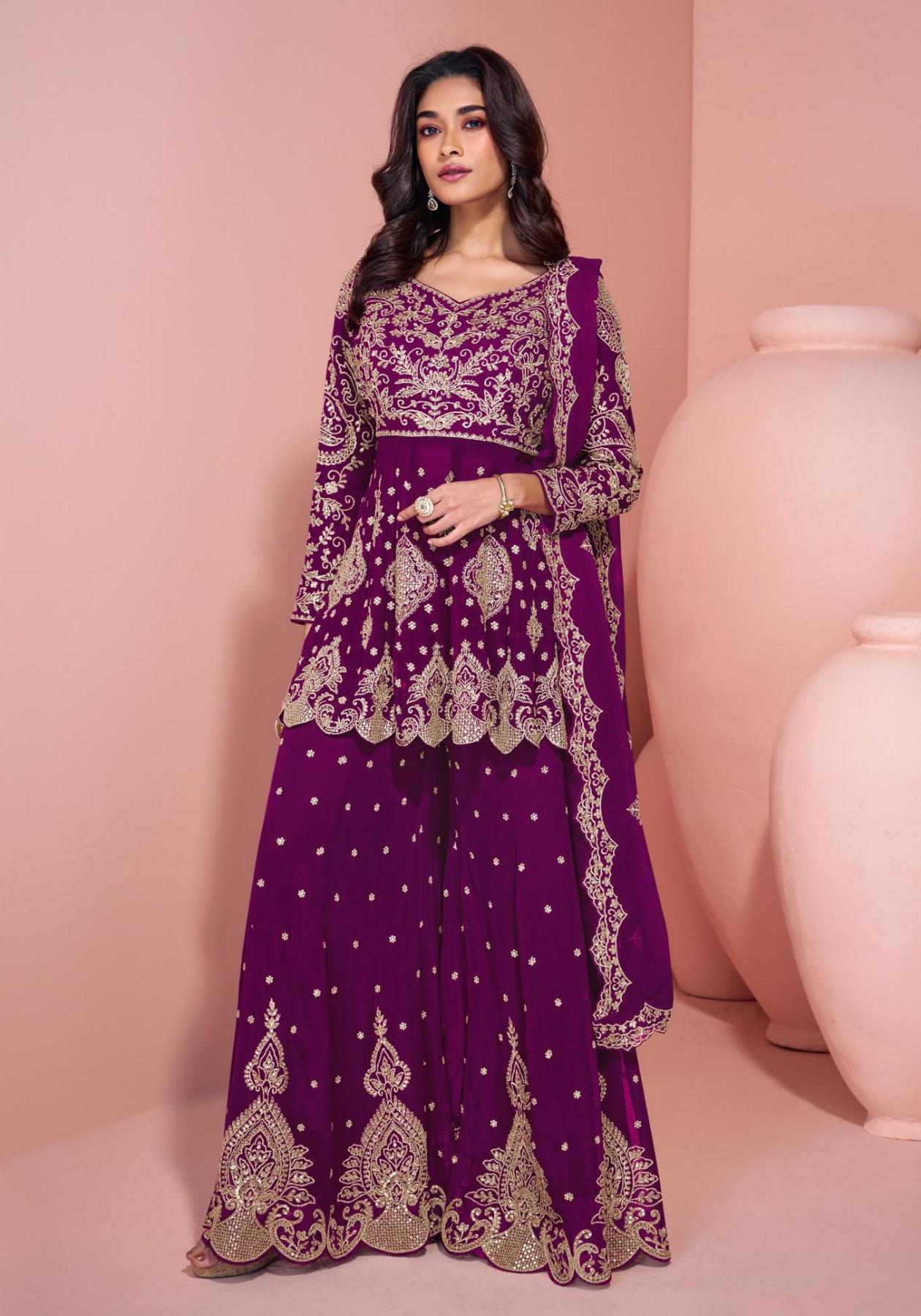 Buy Delightful Georgette Purple Straight Cut Salwar Kameez online.