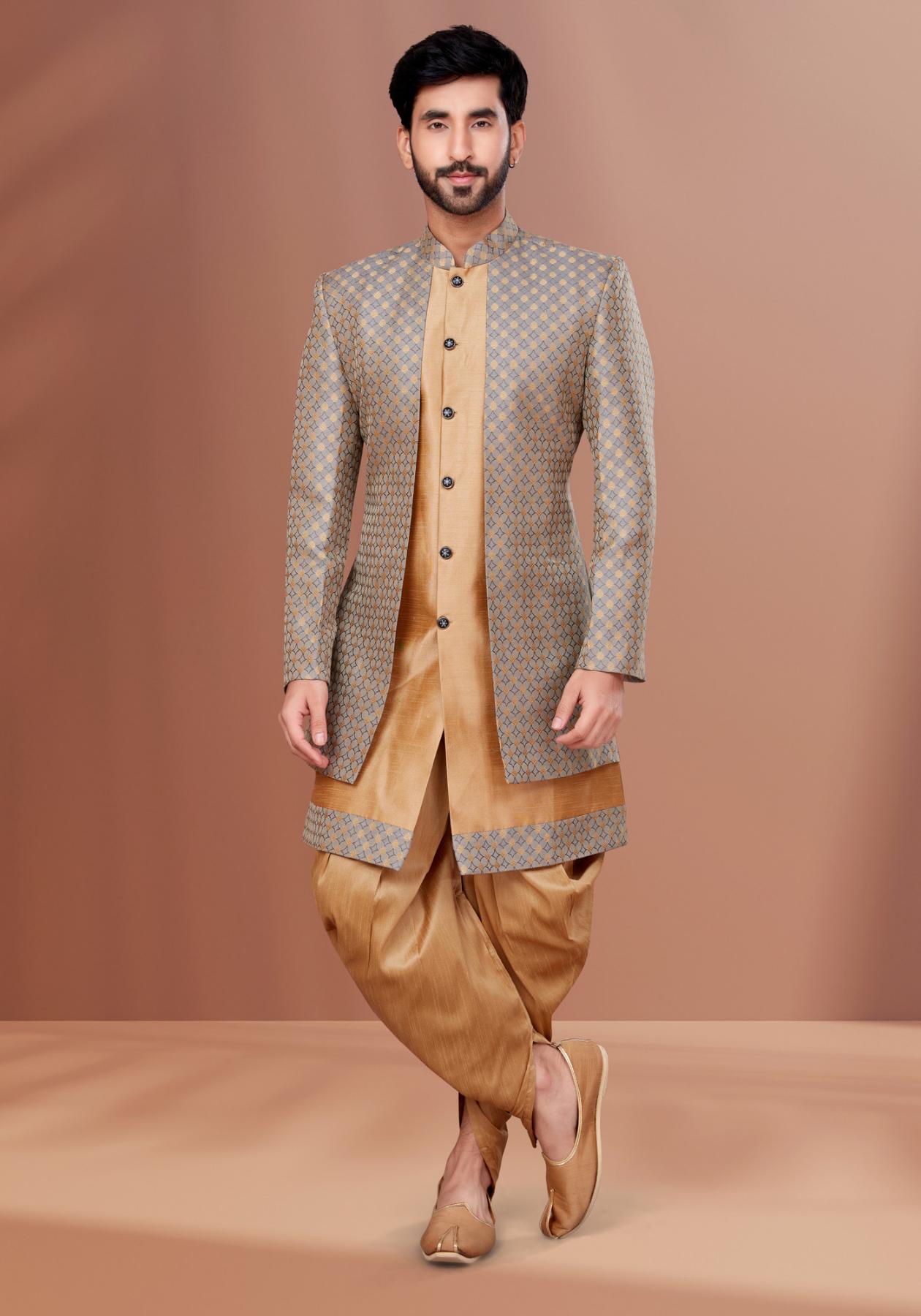 Buy Delightful Satin & Silk Burly Wood & Grey Indo Western online.