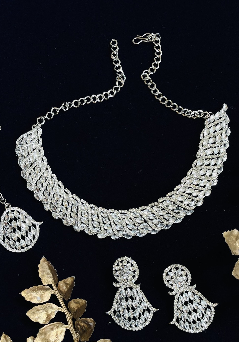 Details: 1 Necklace Set, 2 Earrings, 1 Mang Tikka.