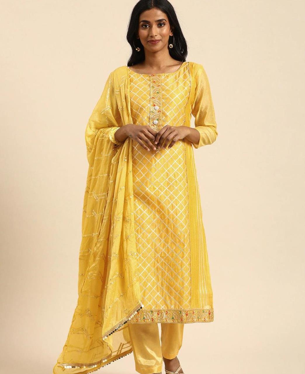 Normally size is measured between the underarm stitching lines from the stressed kameez.