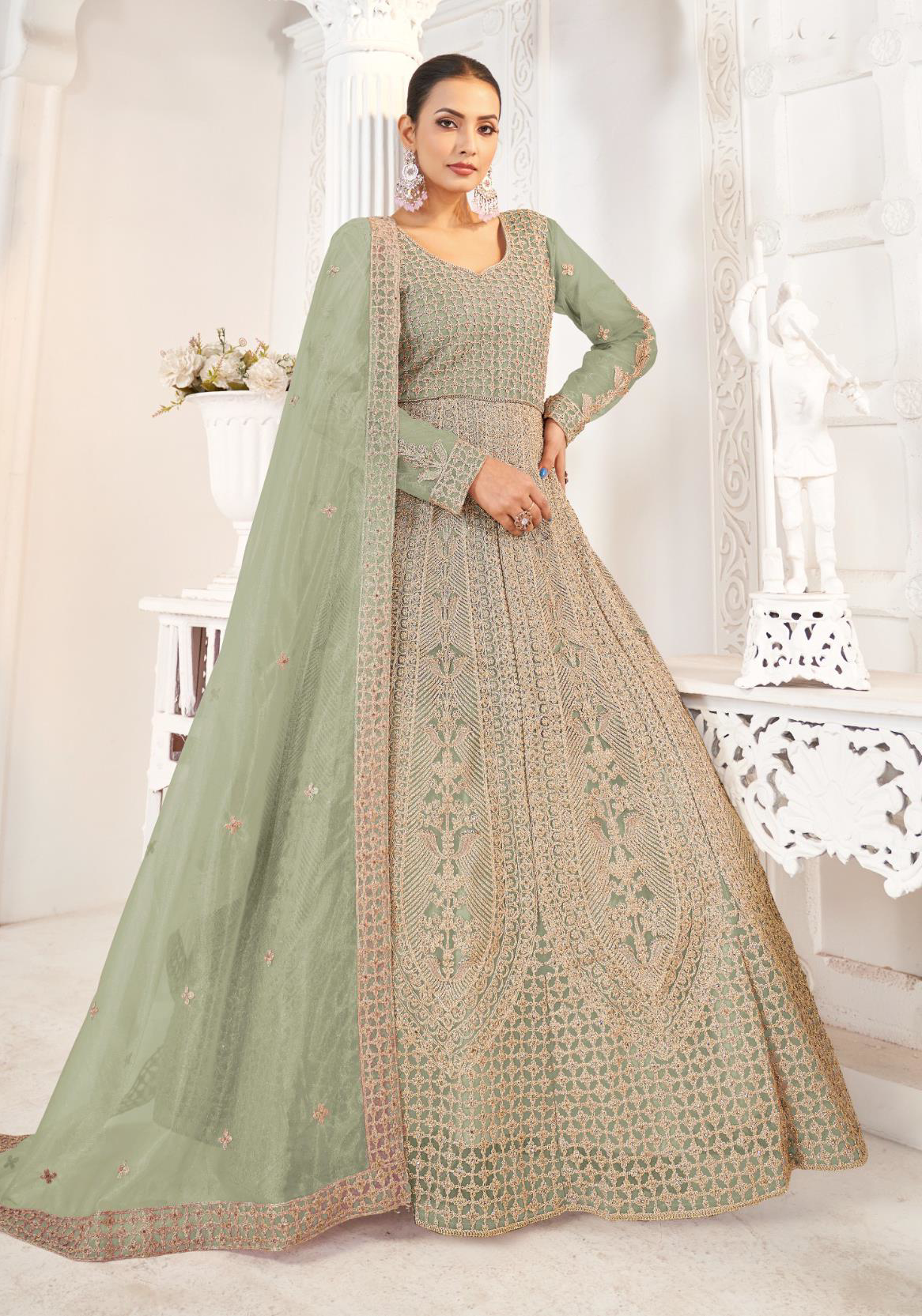 Buy Excellent Net Dark Sea Green Party Wear Gown online.