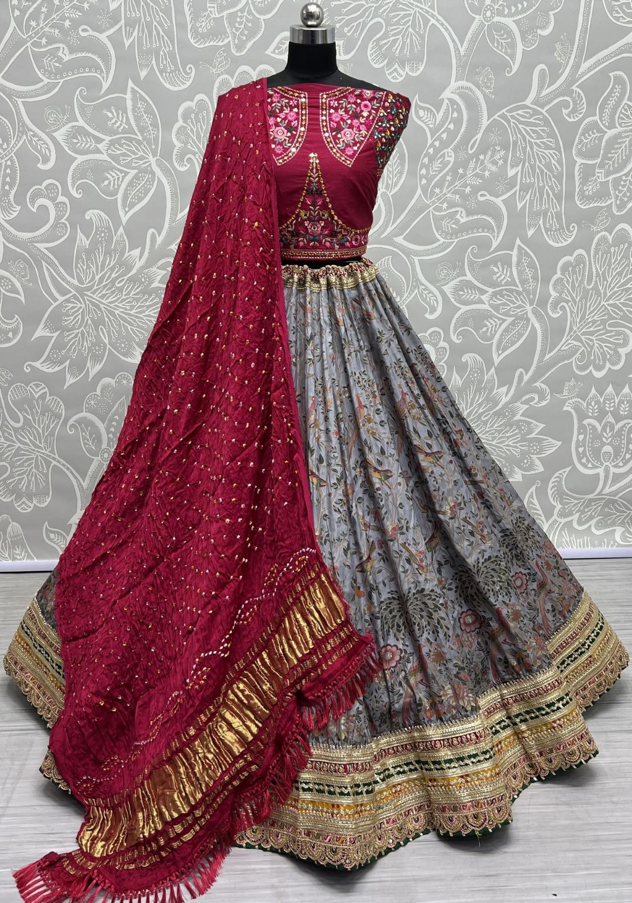 Fine Silk Light Slate Grey & Maroon Lehenga Choli