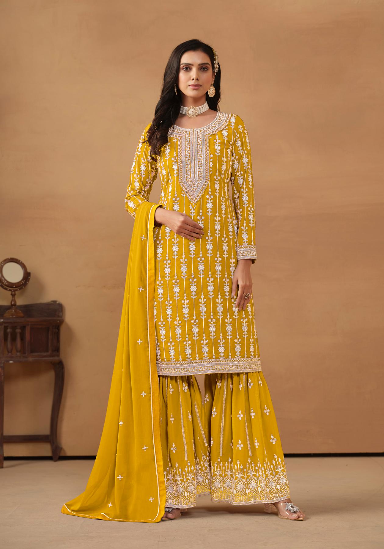 Buy Georgette Dark Golden Rod Straight Cut Salwar Kameez online.