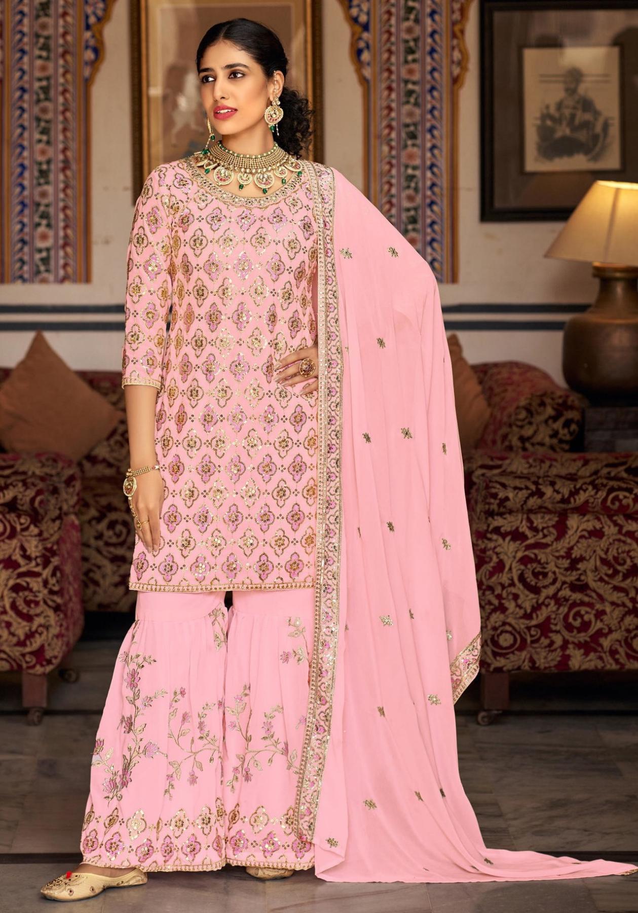 Buy Georgette Pale Violet Red Straight Cut Salwar Kameez online.