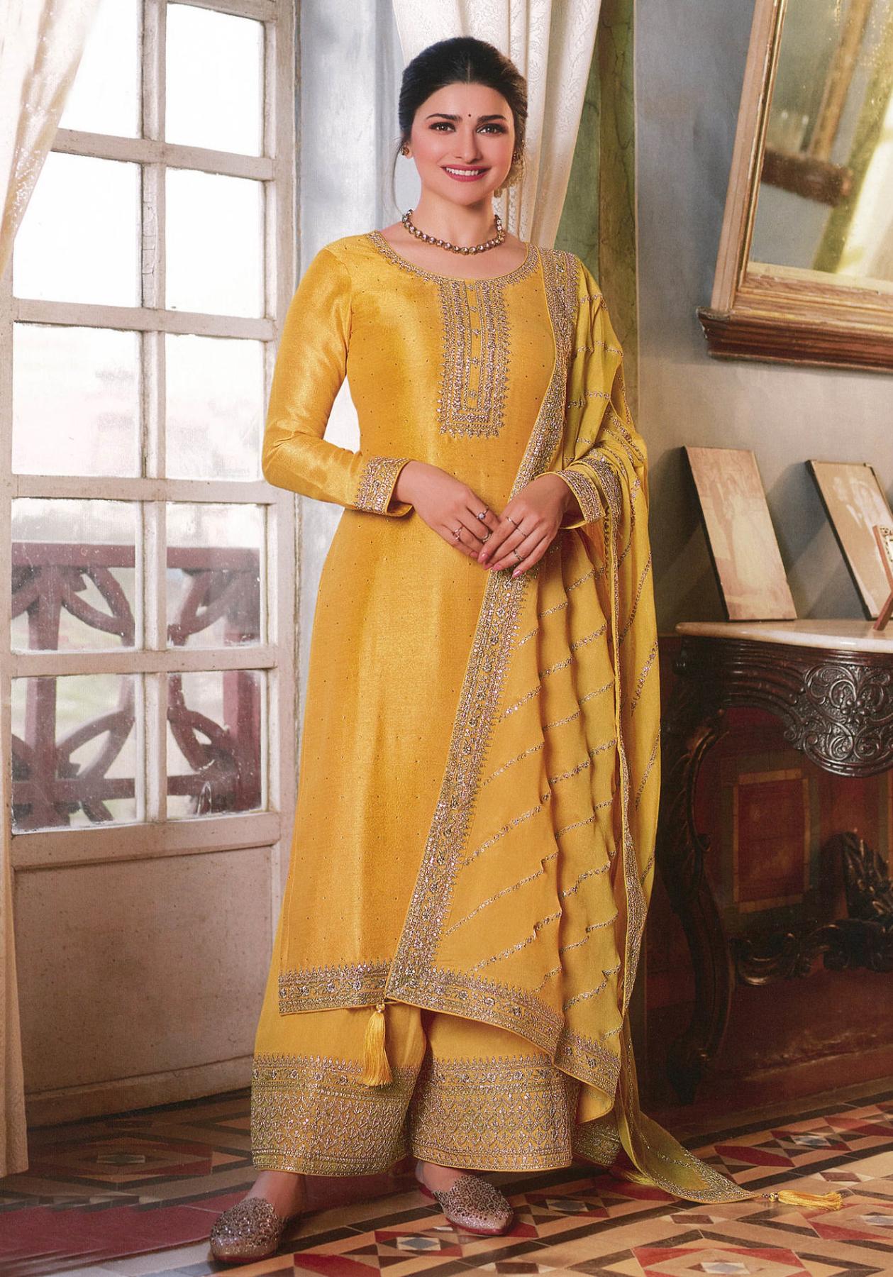Buy Georgette & Silk Golden Rod Straight Cut Salwar Kameez online.