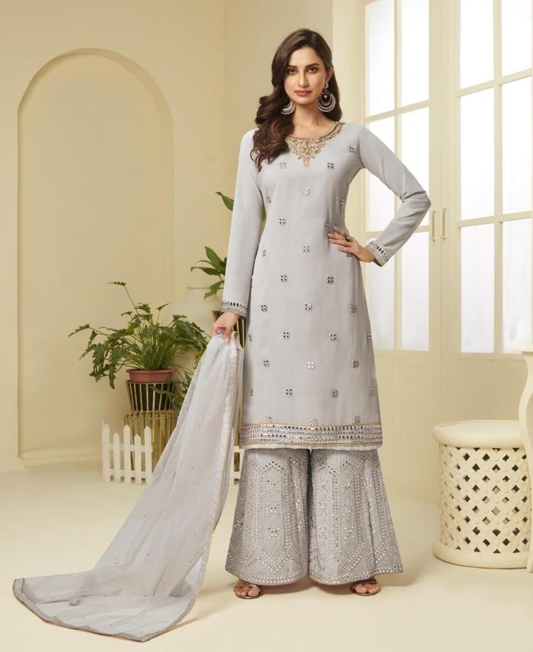 Normally size is measured between the underarm stitching lines from the stressed kameez.