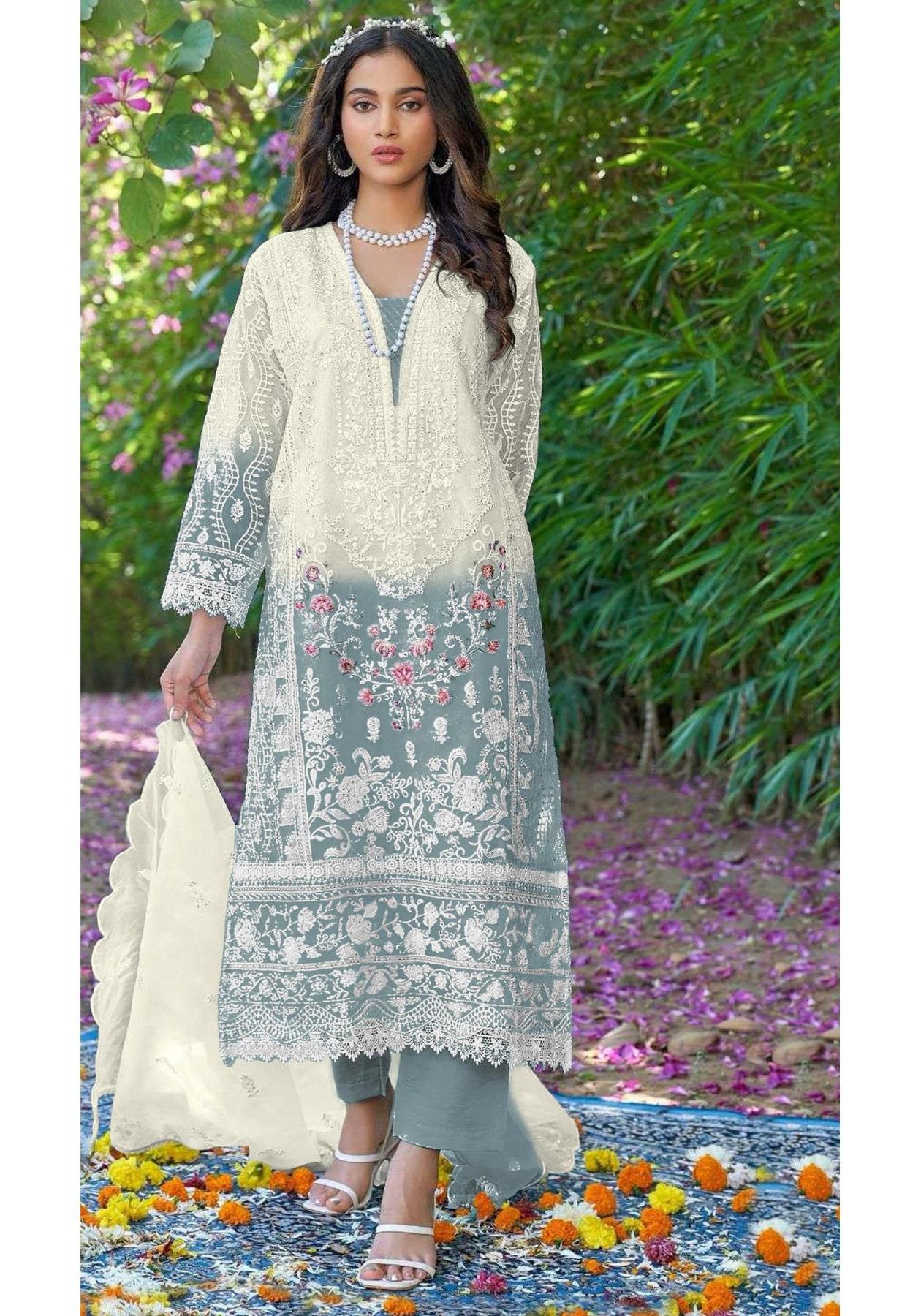 Buy Lovely Organza White Straight Cut Salwar Kameez online.