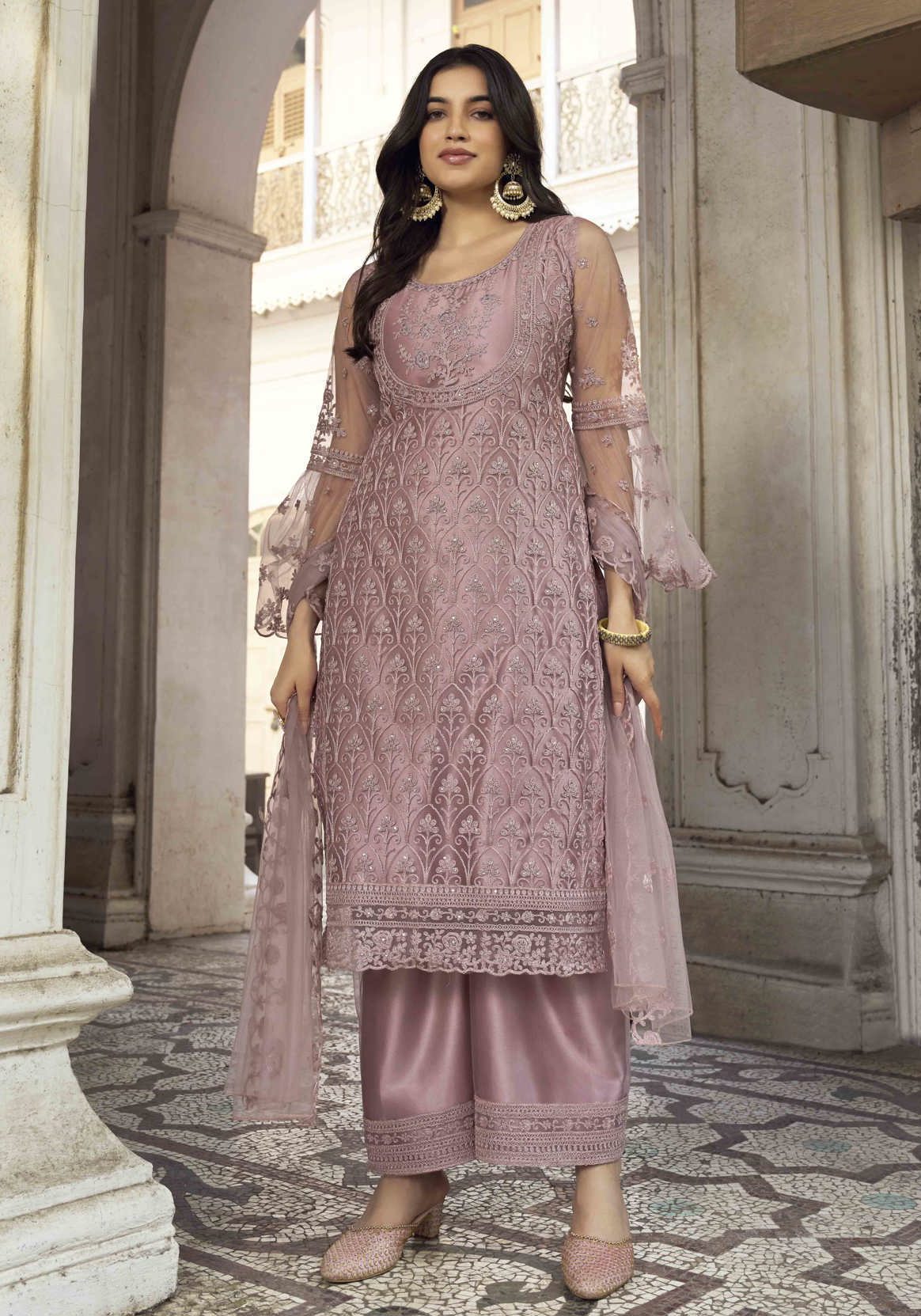 Buy Magnificent Net Rosy Brown Straight Cut Salwar Kameez online.