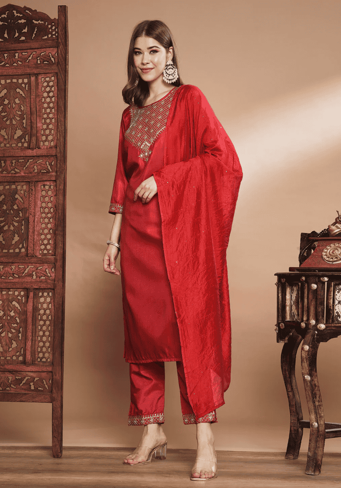 Normally size is measured between the underarm stitching lines from the stressed kameez.