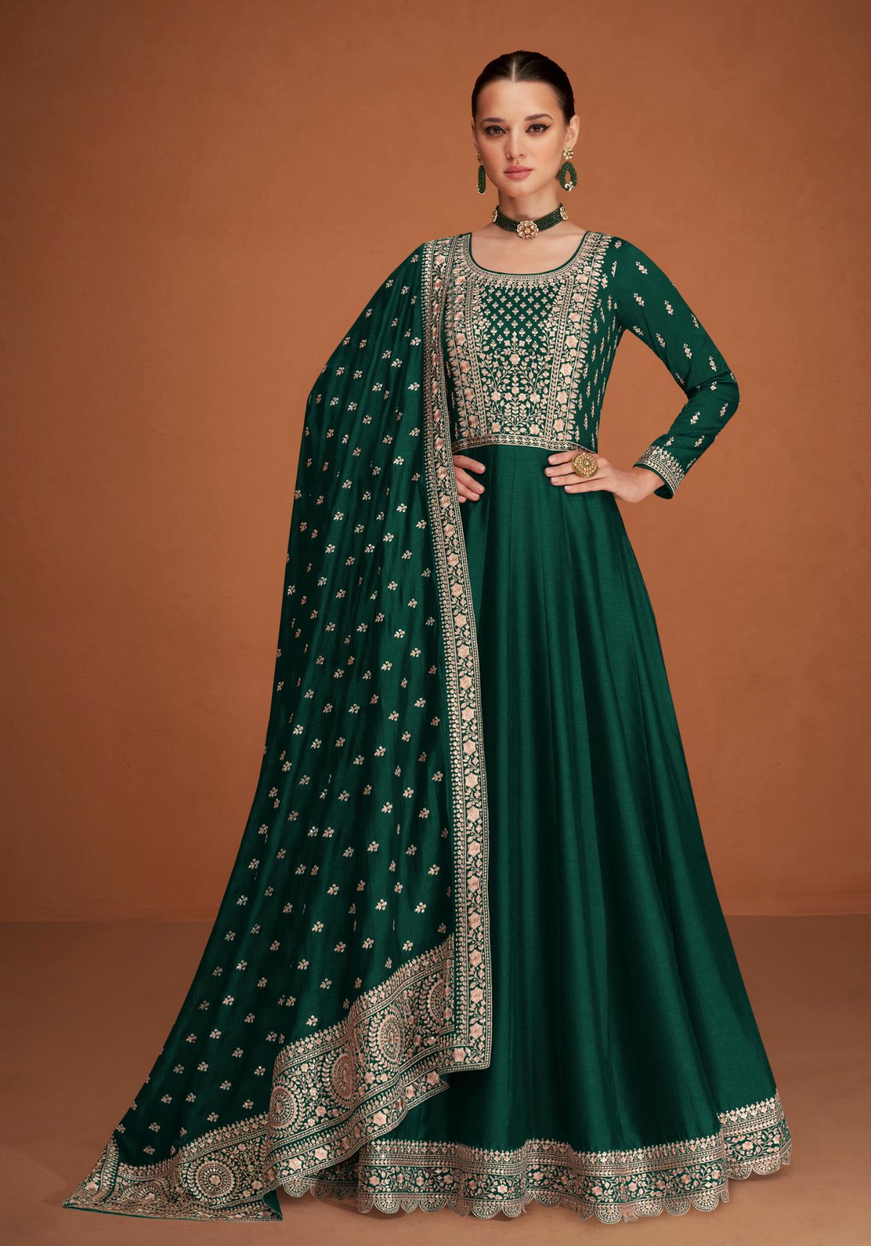 Buy Pleasing Silk Forest Green Party Wear Gown online.