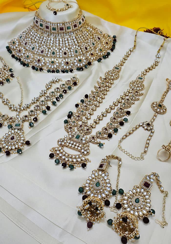 Details: 1 Long Set, 1 Heavy Chocker Set, Pair of Earrings, 1 Pair of Hathpan, 1 Mathapatti Set, 1 Nath [Nosering].
