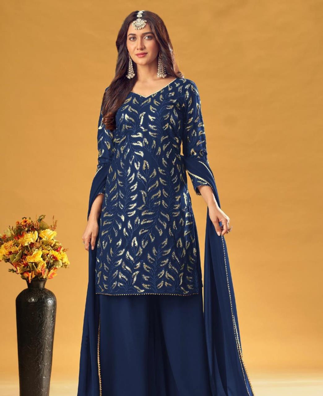 Normally size is measured between the underarm stitching lines from the stressed kameez.