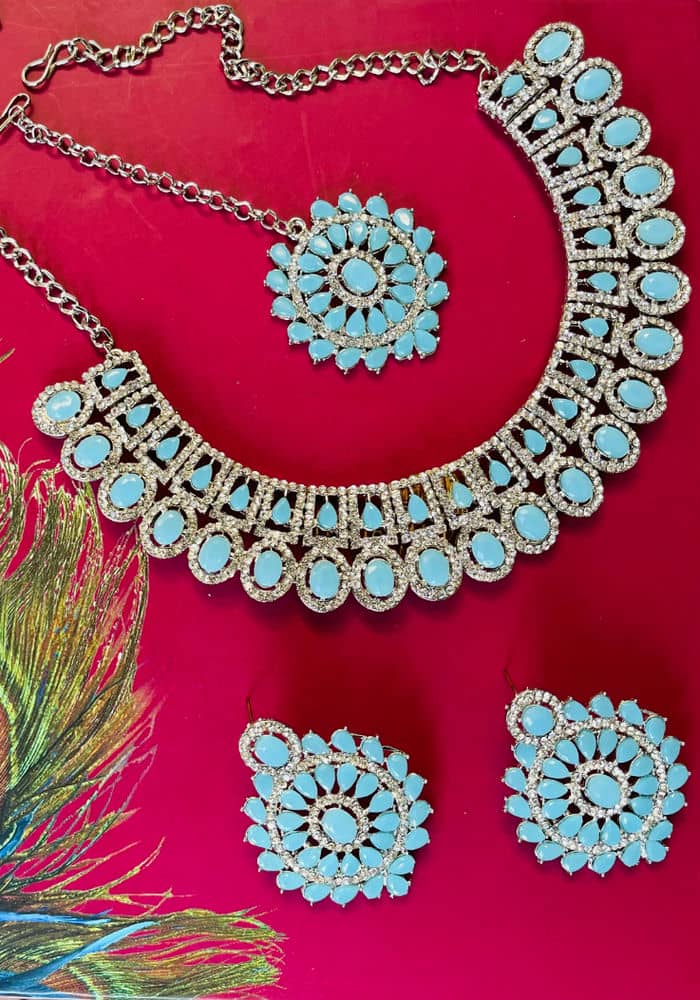 Details: 1 Necklace Set, 2 Earrings, 1 Mang Tikka.