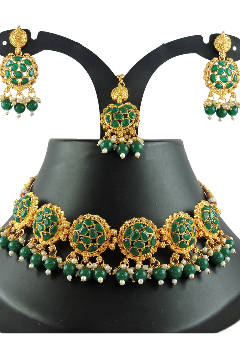 Details: 1 Necklace Set, 2 Earrings, 1 Mang Tikka.