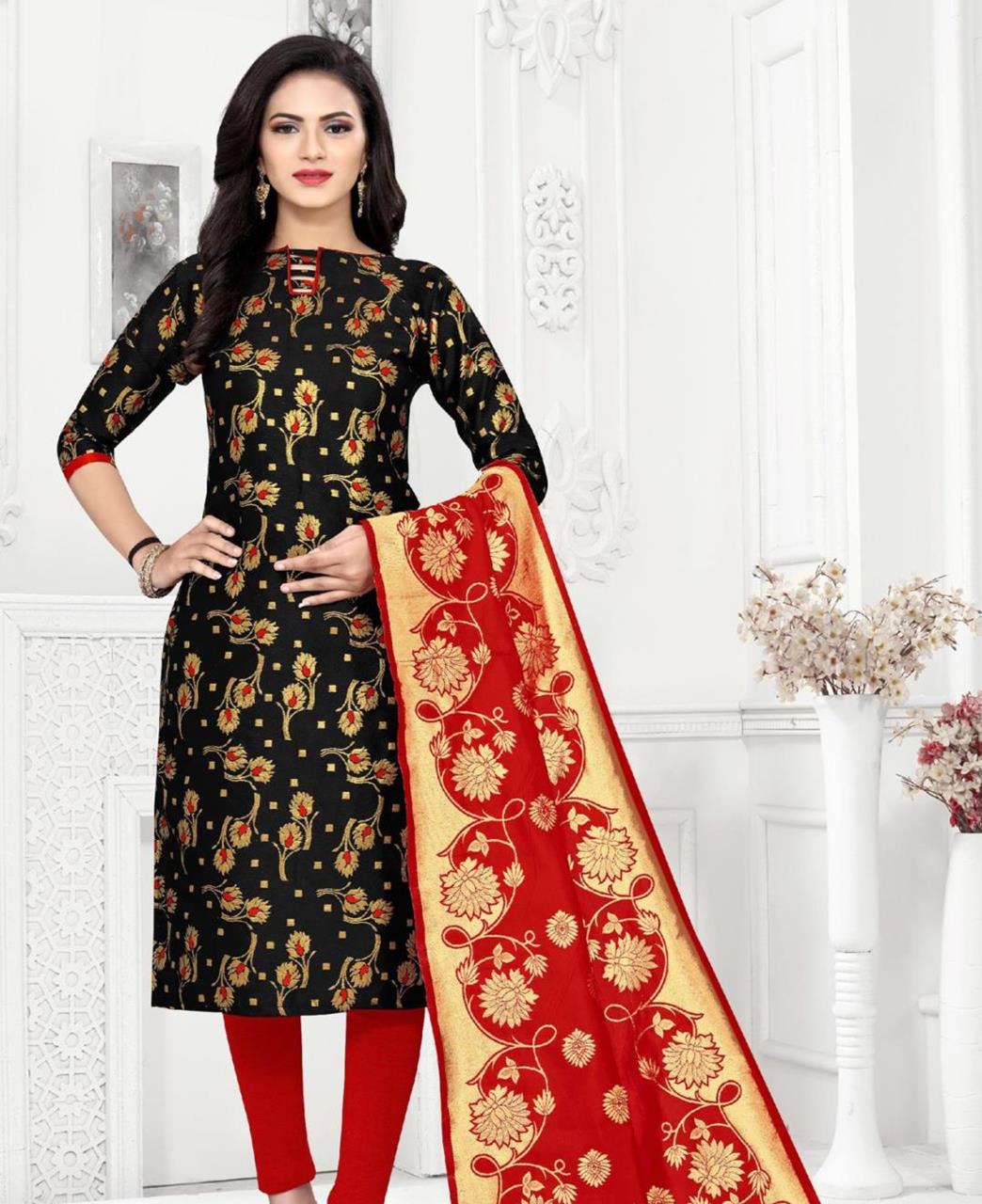 Salwar Kameez is Designed With Weaving With Jacquard Work Work.