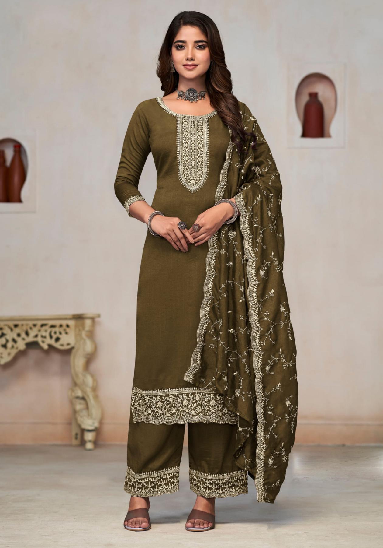 Buy Silk Dark Olive Green Straight Cut Salwar Kameez online.