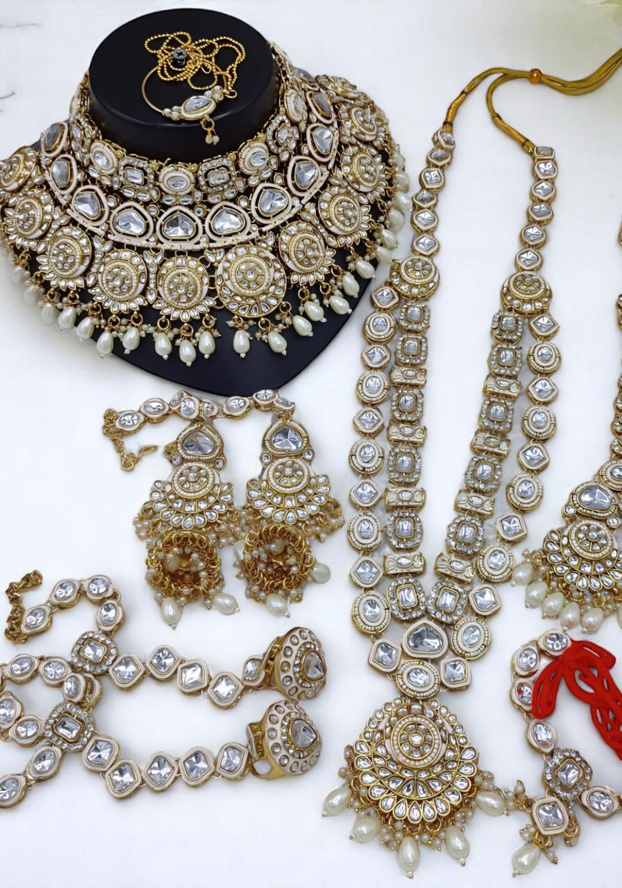 Details: 1 Chokar, 1 Long Necklace, 1 Pai Earrings, 1 Mathapatti ,1 Nath, 1 Pair hathpan, Arm Band.