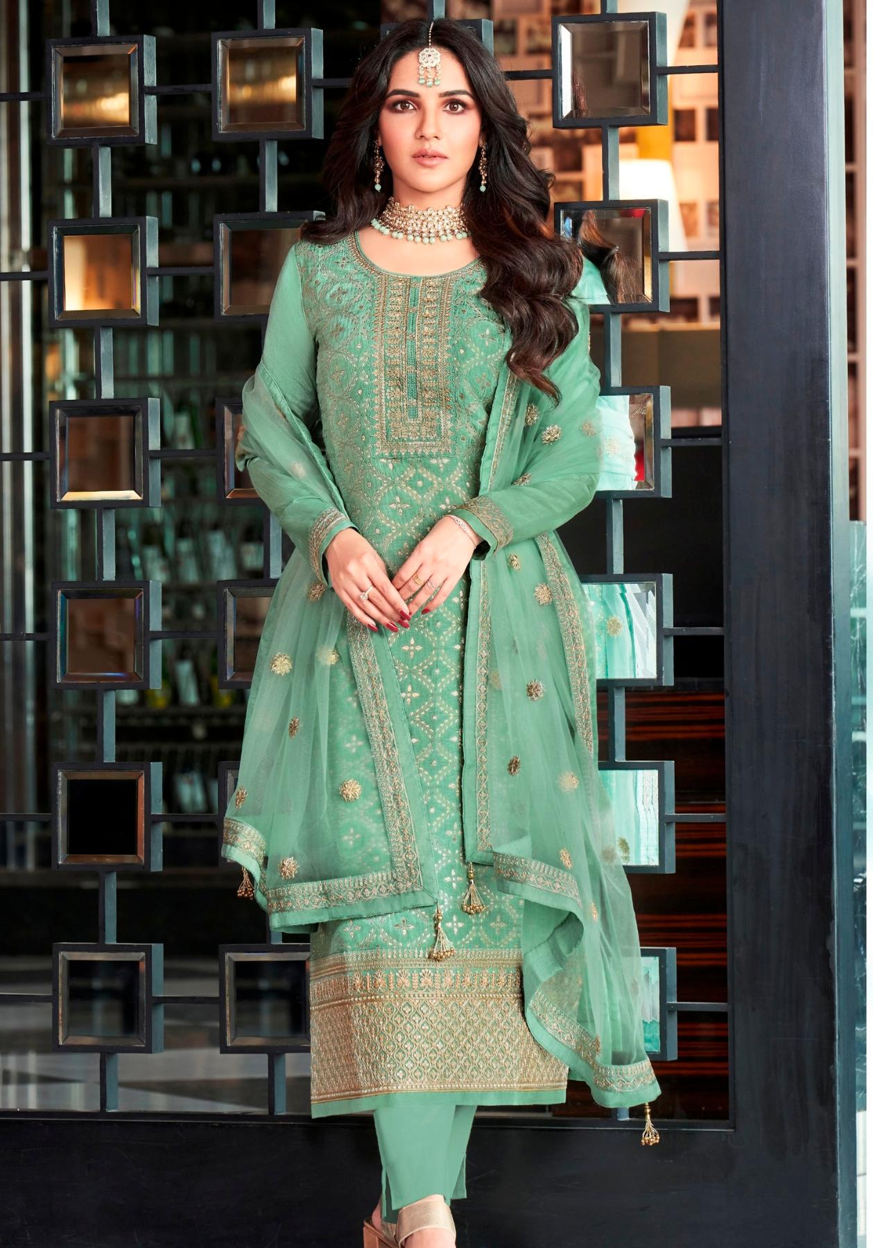 Buy Synthetic Dark Sea Green Straight Cut Salwar Kameez online.