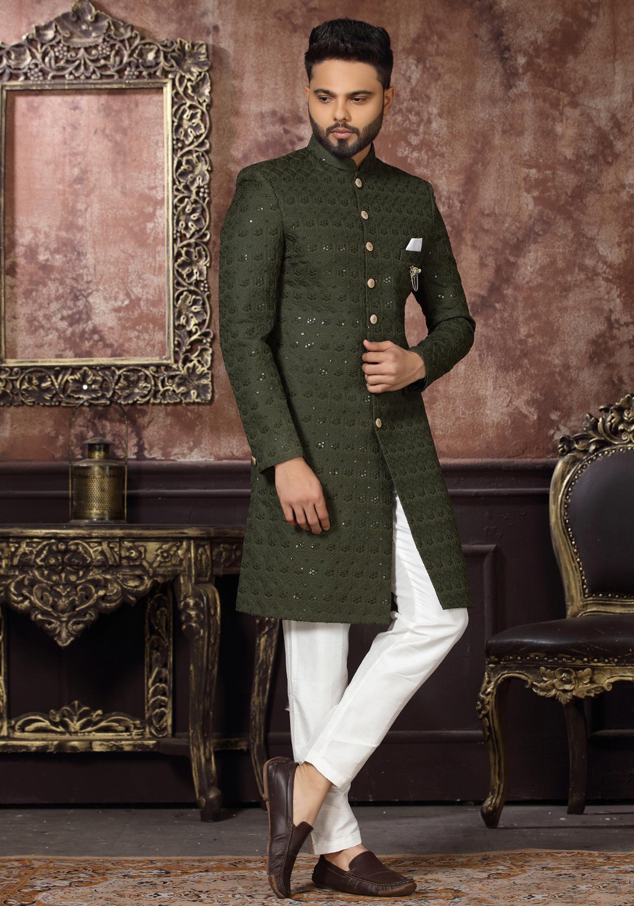 Buy Taking Silk Dark Olive Green Indo Western online.