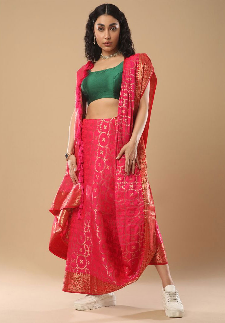 In Pre-stitched saree you will get the saree with stitched plates, belt on the waist and adjustable hooks. So you can wear the saree like a skirt