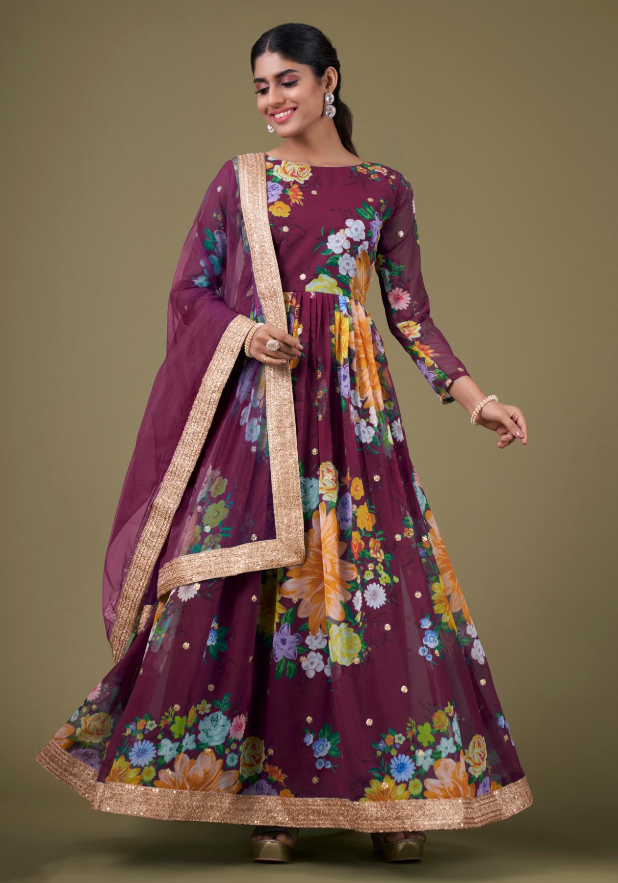 Buy Well Formed Georgette Brown Anarkali Salwar Kameez online.