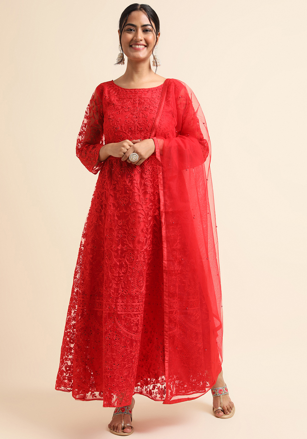 Buy Well Formed Net Crimson Anarkali Salwar Kameez online.