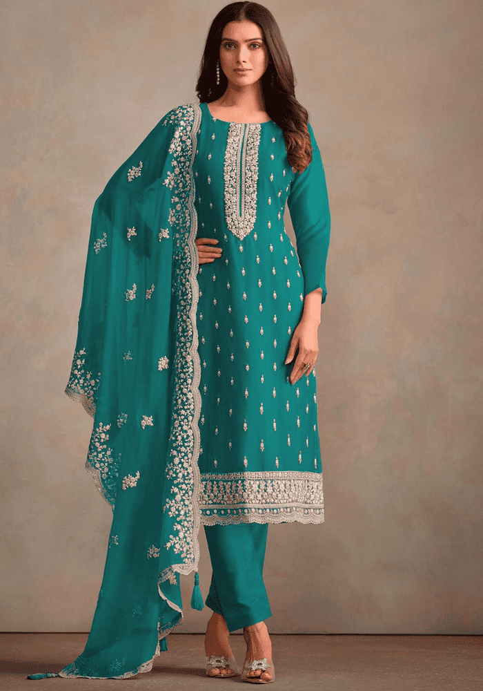 Buy Wonderful Organza Dark Cyan Straight Cut Salwar Kameez online.